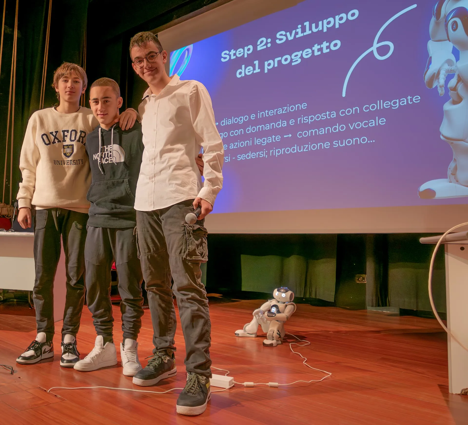 Ciascuno dei cinque gruppi di lavoro ha illustrato alla commissione di valutazione  il progetto realizzato: si tratta di attività attinenti all’introduzione alla Robotica, attraverso la progettazione e la realizzazione di esperienze con il robot educativo NAO di Aldebaran ®.